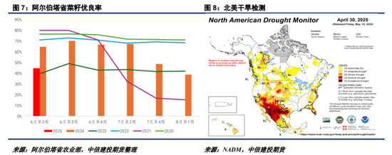 相较于市场对新作菜籽需求侧的关注,新季加菜籽供给题材或未能得到定价。目前市场认为25/26年度加菜籽产量将恢复到1850-1880万吨区间,按照加拿大统计局口径为增产,按照油世界及USDA口径为小幅减产。不过从开局优良率水平来看,目前萨斯喀彻温省、阿尔伯塔省菜籽受到前期土壤墒情偏差影响,优良率偏低。近期气象监测显示加拿大将迎来降水改善,我们倾向于优良率水平有可能环比恢复,但未必能达到去年同期水平。