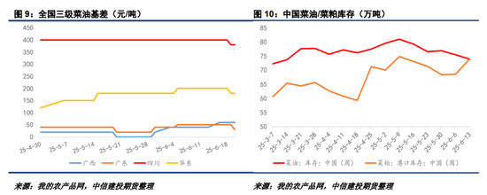 24年9月至今,中加农产品经贸纠纷始终未能完全落地。按照前期WTO指引,6月23日左右中加或将进行新一轮农产品磋商,加菜粕、加菜油议题将位列其中。目前全国表观菜油、菜粕库存仍居于高位,而一部分前期进口的加菜粕尚存储在保税区当中。如果中加经贸超预期好转,这部分菜粕在短期内参与市场流通的概率将增加,从而给内盘带来压力。菜油方面,保税区库存相对有限,但近期基差也出现回落,终端对快速上涨的一口价接受能力比较有限。