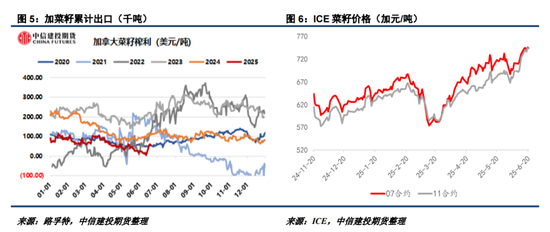 我们在过去几个月中反复强调过24/25年度全球菜籽结转库存将同比下降,但随着时间来到6月底7月初,该预期已经基本被证实落地。全球菜籽价格整体维持偏强态势,加菜籽累计出口逼近900万吨,最终出口数量可能在930-950万吨之间。产地的坚挺报价导致在存在经贸悬念的背景下,加菜籽仍然不能给到中国市场较好榨利机会。不过,近期内盘油粕的快速上行,菜籽理论进口榨利已经有所回升,我们倾向于库存偏少预期已经基本兑现,外盘旧作菜籽进一步挺价空间不大。